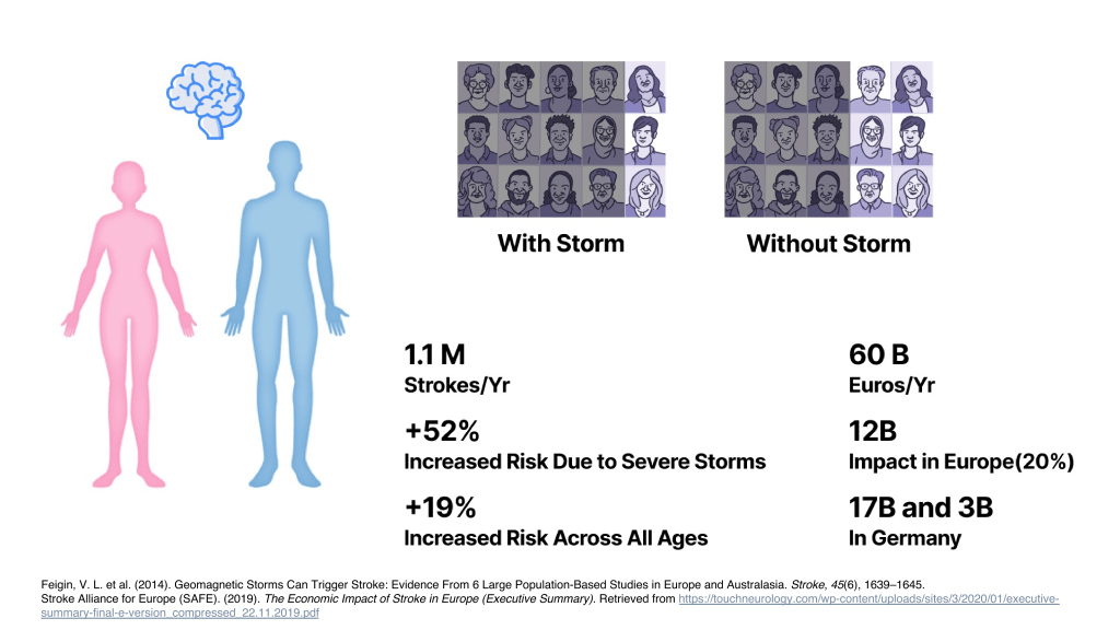 NeuroStorm Predictive model linking geomagnetic storm data with stroke risk, developed in a cross-functional team. Presented via interactive dashboard and awarded 1st place in the CASSINI Hackathon (Germany 2025)